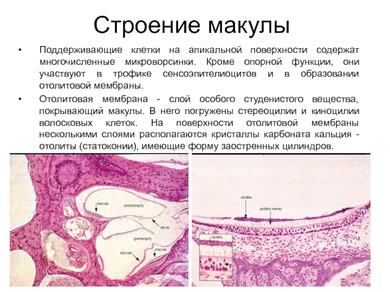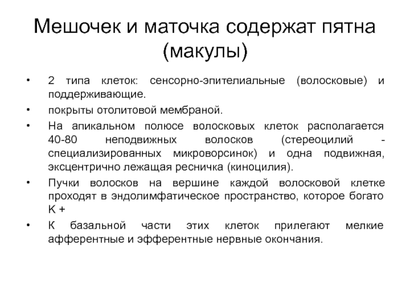 Слайд 15Мешочек и маточка содержат пятна (макулы)