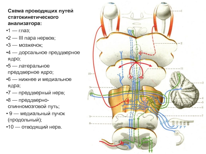 Слайд 34Схема проводящих путей статокинетического анализатора: