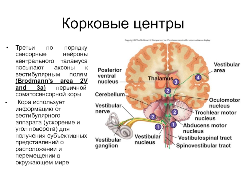 - Кора использует информацию от вестибулярного аппарата (ускорение и угол поворота) для получения субъективных представлений о расположении и перемещении в окружающем мире