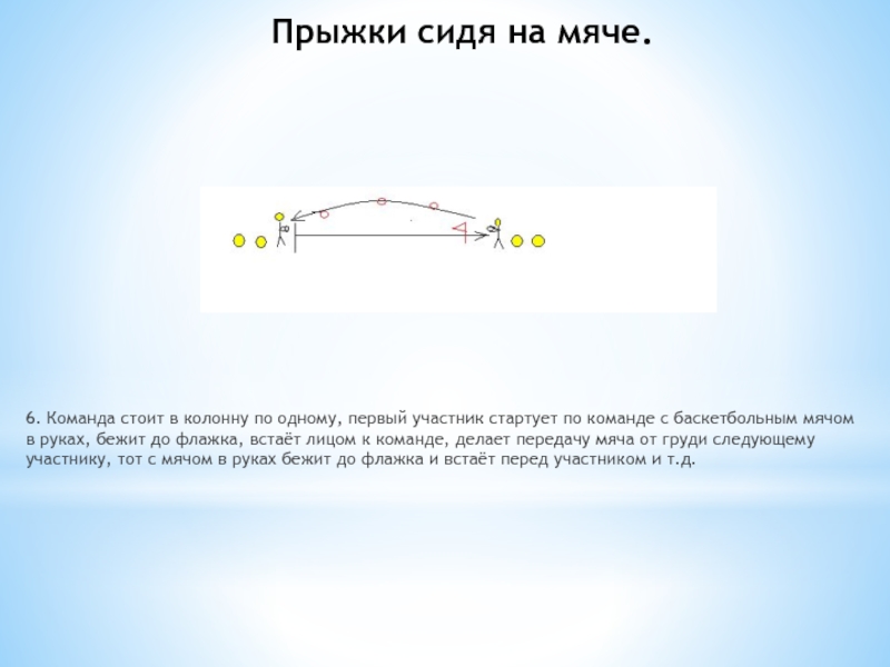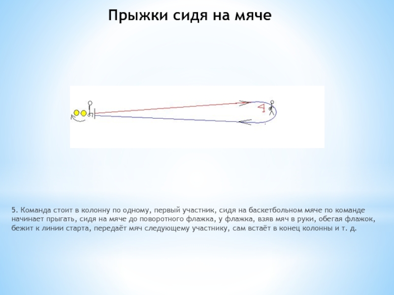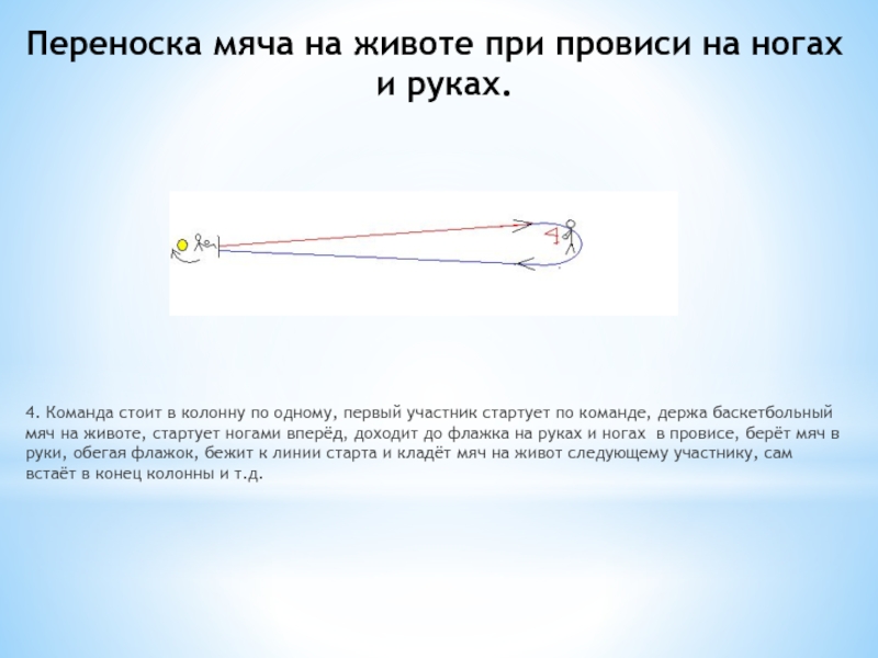 4. Команда стоит в колонну по одному, первый участник стартует по команде, держа баскетбольный мяч на животе, стартует ногами вперёд, доходит до флажка на руках и ногах в провисе, берёт мяч в руки, обегая флажок, бежит к линии старта и кладёт мяч на живот следующему участнику, сам встаёт в конец колонны и т.д.