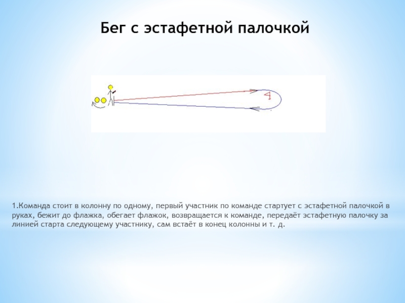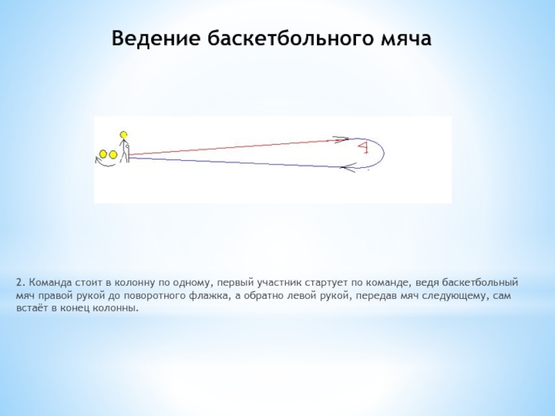 3. Команда стоит в колонну по одному, первый участник стартует по команде, ведя волейбольный мяч эстафетной палочкой до поворотного флажка и обратно, за линией старта передаёт эстафетную палочку с мячом следующему участнику, сам встаёт в конец колонны.
