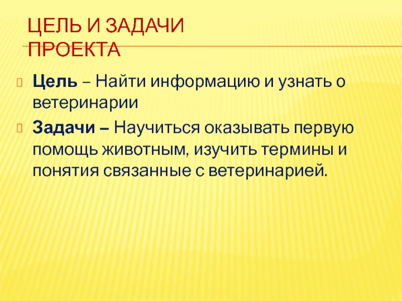 Цель и задачи проектаЦель – Найти информацию и узнать о ветеринарииЗадачи – Научиться оказывать первую помощь животным, изучить термины и понятия связанные с ветеринарией.