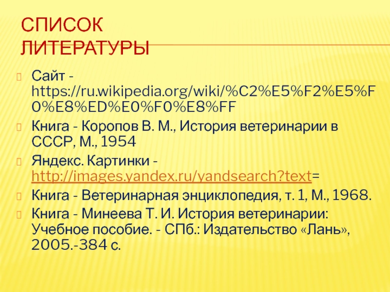 Список литературыСайт - https://ru.wikipedia.org/wiki/%C2%E5%F2%E5%F0%E8%ED%E0%F0%E8%FFКнига - Коропов В. М., История ветеринарии в СССР, М., 1954Яндекс. Картинки - http://images.yandex.ru/yandsearch?text=Книга