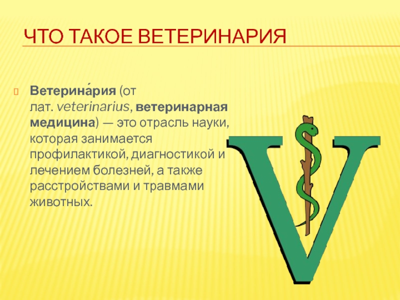 Что такое ветеринарияВетерина́рия (от лат. veterinarius, ветеринарная медицина) — это отрасль науки, которая занимается профилактикой, диагностикой и лечением болезней,