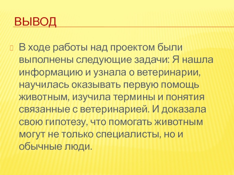 ВыводВ ходе работы над проектом были выполнены следующие задачи: Я нашла информацию и узнала о ветеринарии, научилась