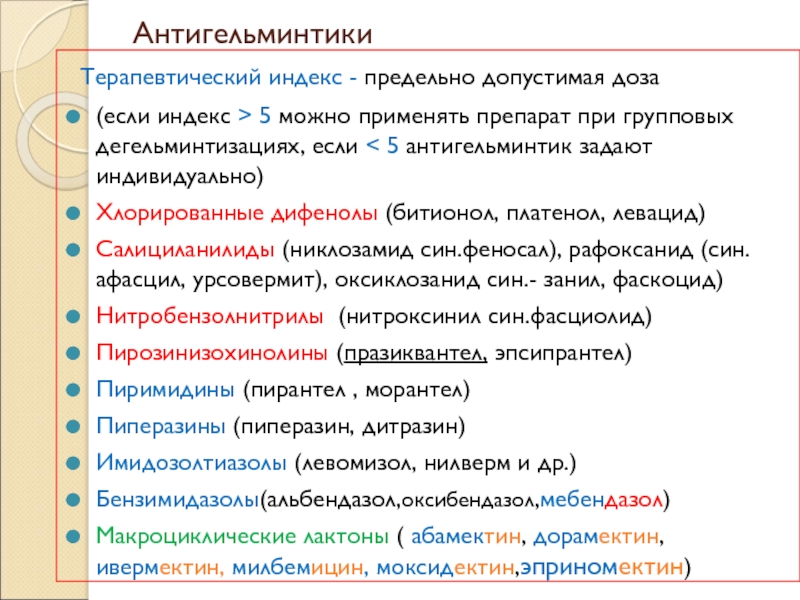 Салициланилиды (никлозамид син.феносал), рафоксанид (син.афасцил, урсовермит), оксиклозанид син.- занил, фаскоцид)