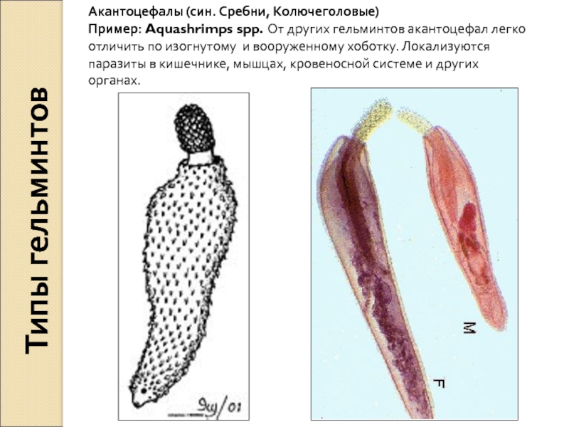 гельминтов акантоцефал легко отличить по изогнутому и вооруженному хоботку. Локализуются