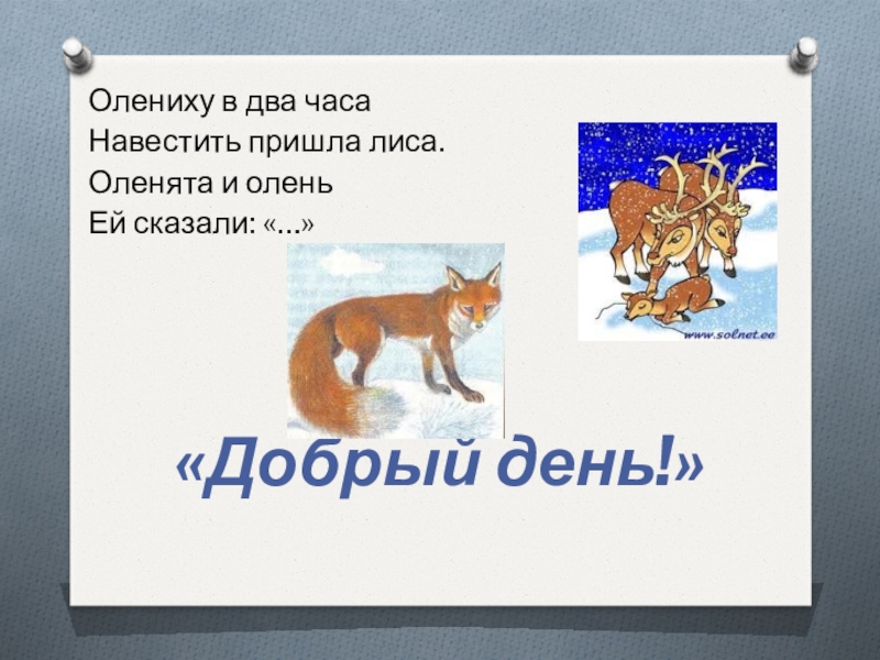 Олениху в два часаНавестить пришла лиса.Оленята и оленьЕй сказали: «…»«Добрый день!»