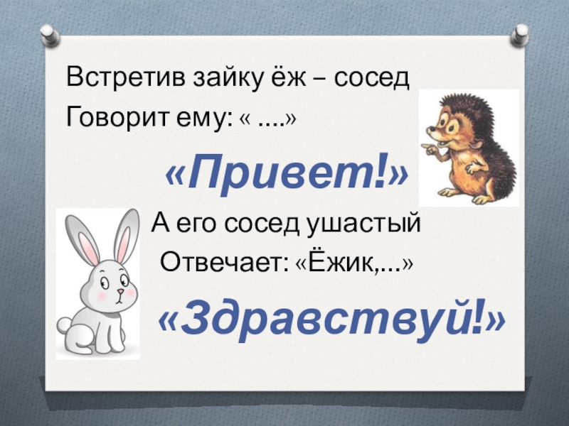 Встретив зайку ёж – соседГоворит ему: « ….»«Привет!»А его сосед ушастыйОтвечает: «Ёжик,…»«Здравствуй!»