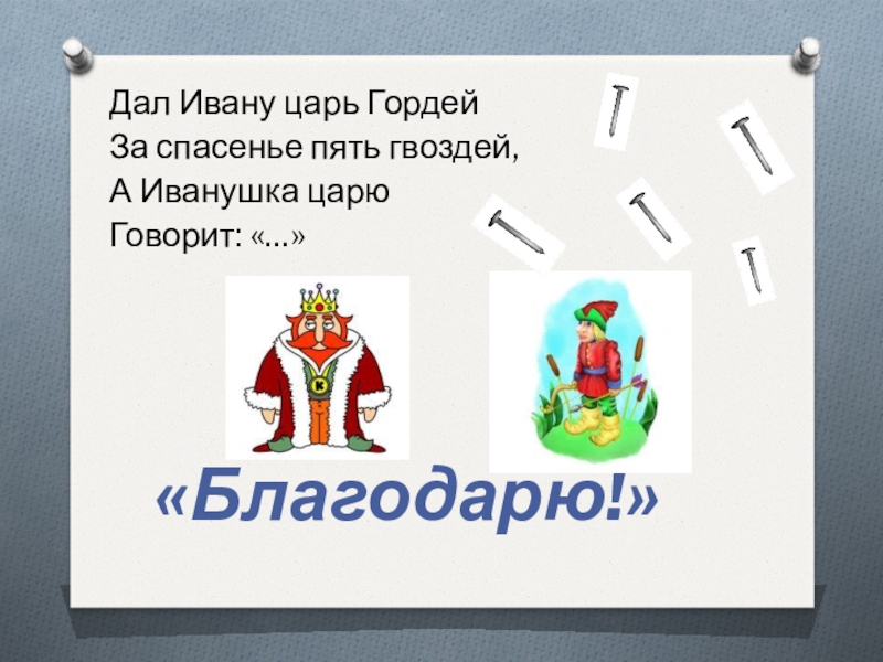 Дал Ивану царь ГордейЗа спасенье пять гвоздей,А Иванушка царюГоворит: «…»«Благодарю!»