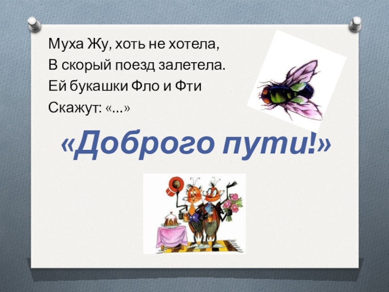 Муха Жу, хоть не хотела,В скорый поезд залетела.Ей букашки Фло и ФтиСкажут: «…»«Доброго пути!»