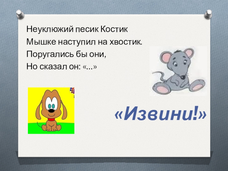 Неуклюжий песик КостикМышке наступил на хвостик.Поругались бы они,Но сказал он: «…»«Извини!»