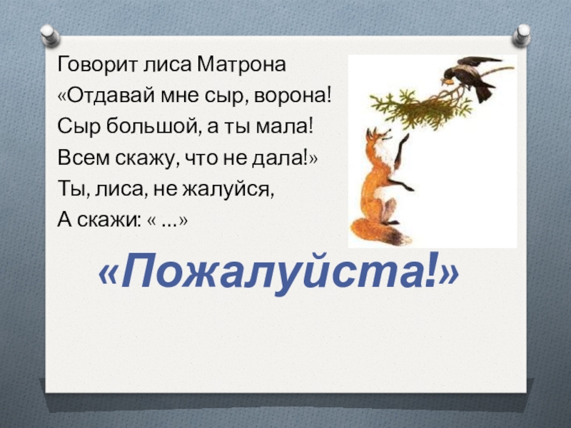 Говорит лиса Матрона«Отдавай мне сыр, ворона!Сыр большой, а ты мала!Всем скажу, что не дала!»Ты, лиса, не жалуйся,А