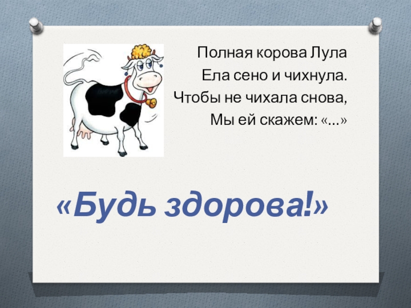 Полная корова ЛулаЕла сено и чихнула.Чтобы не чихала снова,Мы ей скажем: «…»«Будь здорова!»