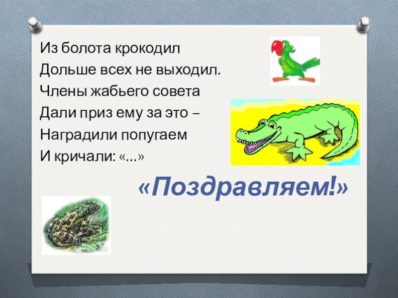 Из болота крокодилДольше всех не выходил.Члены жабьего советаДали приз ему за это –Наградили попугаемИ кричали: «…»«Поздравляем!»