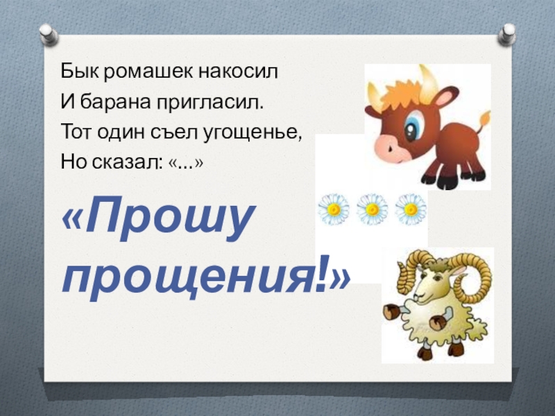 Бык ромашек накосилИ барана пригласил.Тот один съел угощенье,Но сказал: «…»«Прошу прощения!»