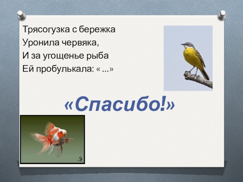 Трясогузка с бережкаУронила червяка,И за угощенье рыбаЕй пробулькала: « …»«Спасибо!»