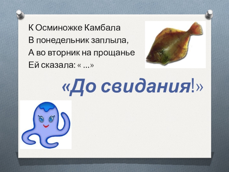 К Осминожке КамбалаВ понедельник заплыла,А во вторник на прощаньеЕй сказала: « …»«До свидания!»