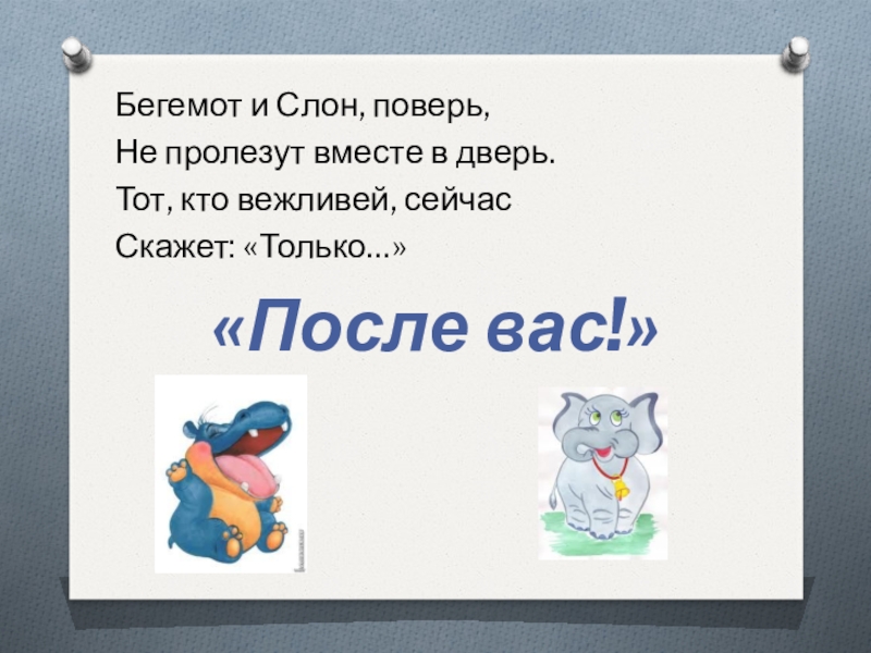 Бегемот и Слон, поверь,Не пролезут вместе в дверь.Тот, кто вежливей, сейчасСкажет: «Только…»«После вас!»