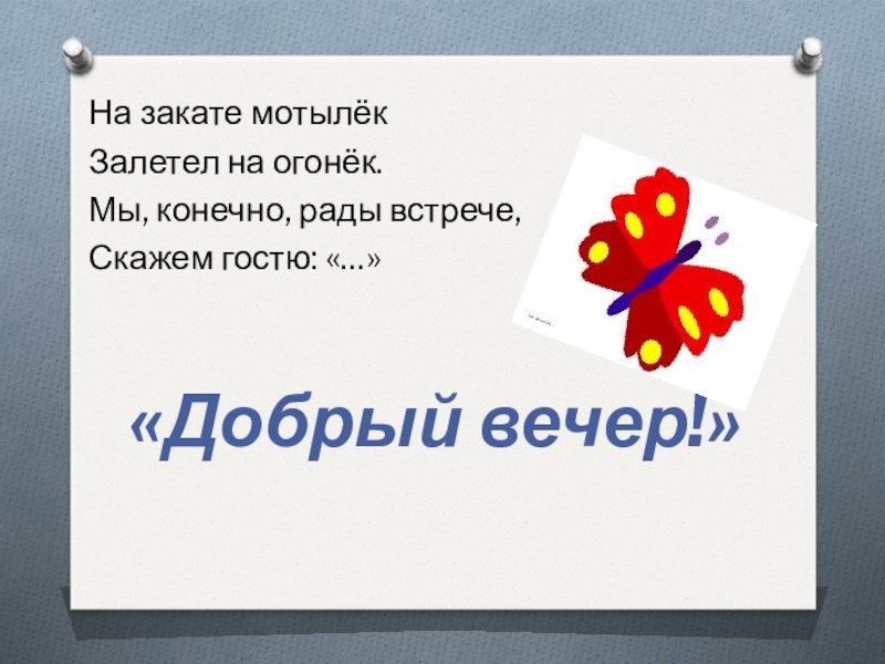 На закате мотылёкЗалетел на огонёк.Мы, конечно, рады встрече,Скажем гостю: «…»«Добрый вечер!»