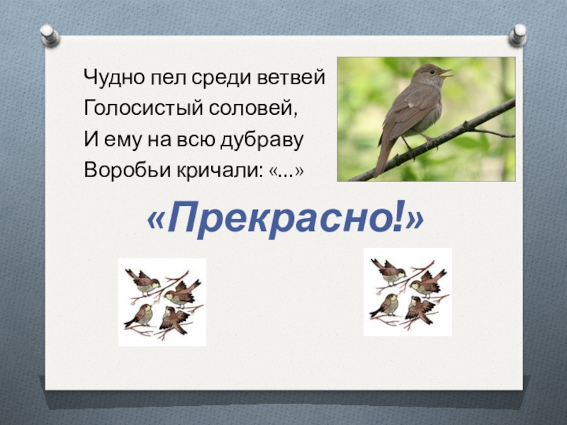 Чудно пел среди ветвейГолосистый соловей,И ему на всю дубравуВоробьи кричали: «…»«Прекрасно!»