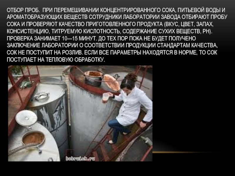 Слайд 10Отбор проб. При перемешивании концентрированного сока, питьевой воды и ароматобразующих