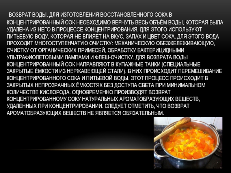 в процессе концентрирования. Для этого используют питьевую воду, которая не влияет на вкус, запах и цвет сока. Для этого вода проходит многоступенчатую очистку: механическую обезжележивающую, очистку от органических примесей, обработку бактерицидными ультрафиолетовыми лампами и флеш-очистку. Для возврата воды концентрированный сок направляют в купажные танки (специальные закрытые ёмкости из нержавеющей стали). В них происходит перемешивание концентрированного сока и питьевой воды. Этот процесс происходит в закрытых непрозрачных ёмкостях без доступа света при минимальном количестве кислорода. Одновременно производят возврат концентрированному соку натуральных ароматобразующих веществ, удаленных при концентрировании. Следует отметить, что возврат ароматобразующих веществ не является обязательным.