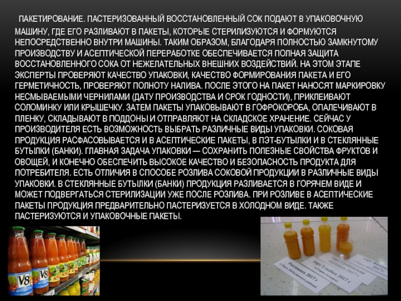 машины. Таким образом, благодаря полностью замкнутому производству и асептической переработке обеспечивается полная защита восстановленного сока от нежелательных внешних воздействий. На этом этапе эксперты проверяют качество упаковки, качество формирования пакета и его герметичность, проверяют полноту налива. После этого на пакет наносят маркировку несмываемыми чернилами (дату производства и срок годности), приклеивают соломинку или крышечку. Затем пакеты упаковывают в гофрокороба, опалечивают в пленку, складывают в поддоны и отправляют на складское хранение. Сейчас у производителя есть возможность выбрать различные виды упаковки. Соковая продукция расфасовывается и в асептические пакеты, в ПЭТ-бутылки и в стеклянные бутылки (банки). Главная задача упаковки — сохранить полезные свойства фруктов и овощей, и конечно обеспечить высокое качество и безопасность продукта для потребителя. Есть отличия в способе розлива соковой продукции в различные виды упаковки. В стеклянные бутылки (банки) продукция разливается в горячем виде и может подвергаться стерилизации уже после розлива. При розливе в асептические пакеты продукция предварительно пастеризуется в холодном виде. Также пастеризуются и упаковочные пакеты.
