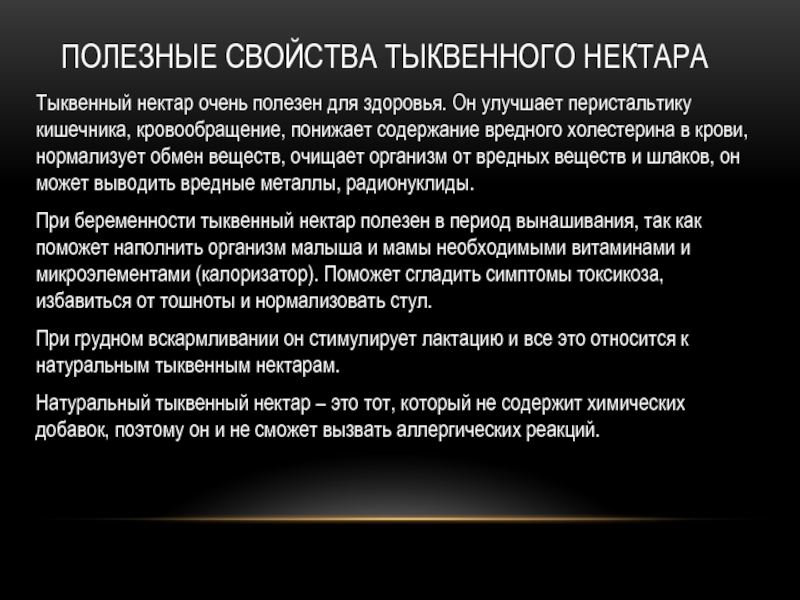 При грудном вскармливании он стимулирует лактацию и все это относится к натуральным тыквенным нектарам.