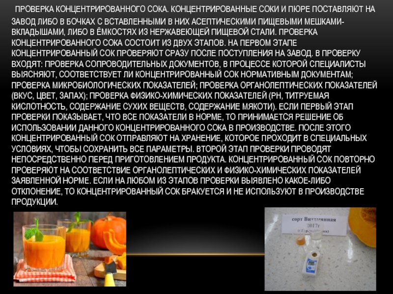 мешками-вкладышами, либо в ёмкостях из нержавеющей пищевой стали. Проверка концентрированного сока состоит из двух этапов. На первом этапе концентрированный сок проверяют сразу после поступления на завод. В проверку входят: проверка сопроводительных документов, в процессе которой специалисты выясняют, соответствует ли концентрированный сок нормативным документам; проверка микробиологических показателей; проверка органолептических показателей (вкус, цвет, запах); проверка физико-химических показателей (рН, титруемая кислотность, содержание сухих веществ, содержание мякоти). Если первый этап проверки показывает, что все показатели в норме, то принимается решение об использовании данного концентрированного сока в производстве. После этого концентрированный сок отправляют на хранение, которое проходит в специальных условиях, чтобы сохранить все параметры. Второй этап проверки проводят непосредственно перед приготовлением продукта. Концентрированный сок повторно проверяют на соответствие органолептических и физико-химических показателей заявленной норме. Если на любом из этапов проверки выявлено какое-либо отклонение, то концентрированный сок бракуется и не используют в производстве продукции.