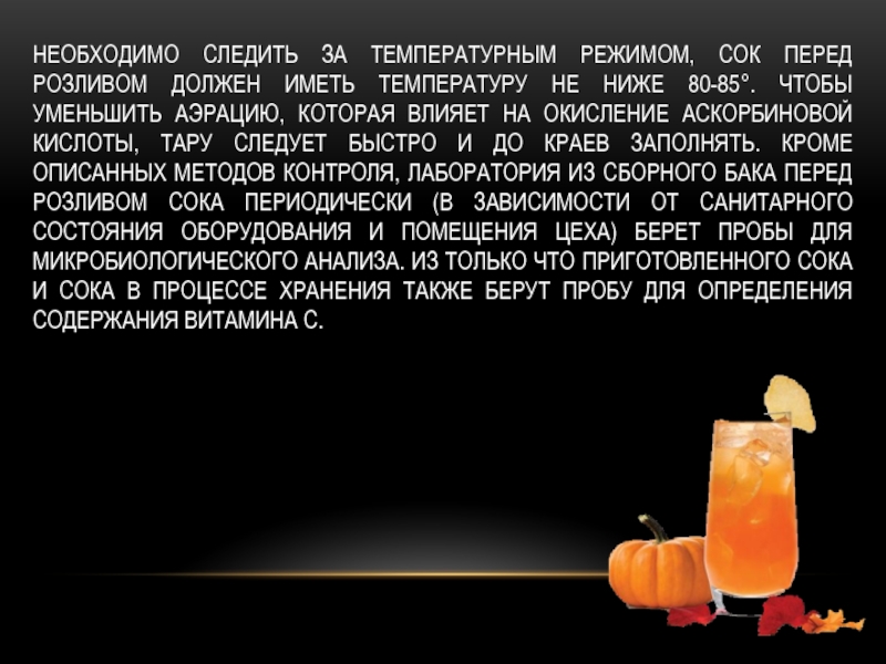 Слайд 7Необходимо следить за температурным режимом, сок перед розливом должен иметь