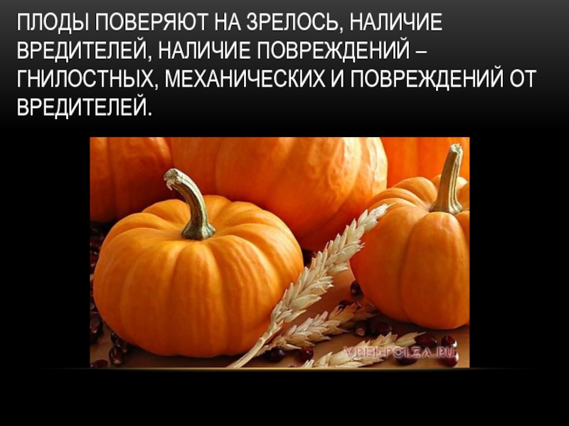 Слайд 6Плоды поверяют на зрелось, наличие вредителей, наличие повреждений – гнилостных,