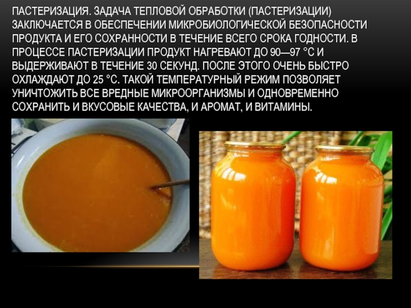 Слайд 11Пастеризация. Задача тепловой обработки (пастеризации) заключается в обеспечении микробиологической безопасности