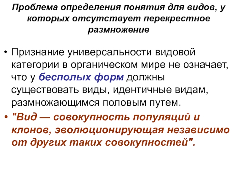 Слайд 75Проблема определения понятия для видов, у которых отсутствует перекрестное размножение