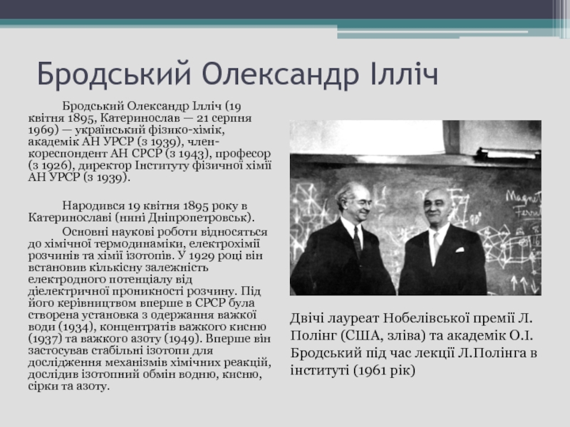 Двічі лауреат Нобелівської премії Л.Полінг (США, зліва) та академік О.І.Бродський під час лекції Л.Полінга в інституті (1961 рік)