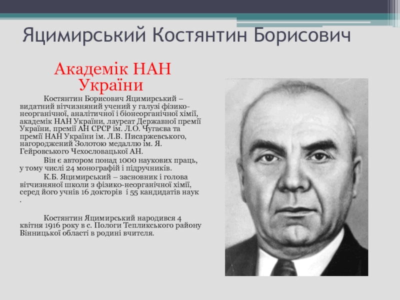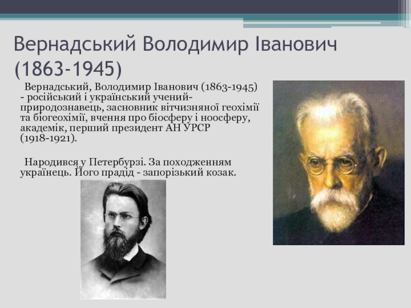 і ноосферу, академік, перший президент АН УРСР (1918-1921).Народився у Петербурзі. За походженням українець. Його прадід - запорізький козак.