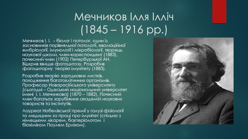імунології і мікробіології, творець наукової школи, член-кореспондент (1883), почесний член (1902) Петербурзької АН. Відкрив явище фагоцитозу, Розробив фагоцитарну теорію імунітету (1883).