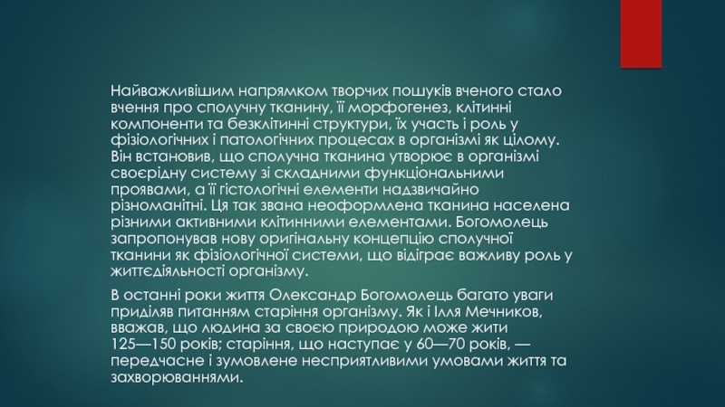 Слайд 7Найважливішим напрямком творчих пошуків вченого стало вчення про сполучну тканину,