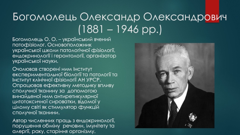 Слайд 6Олександр Олександрович Богомолець створив учення про фізіологічну систему сполучної тканини, до