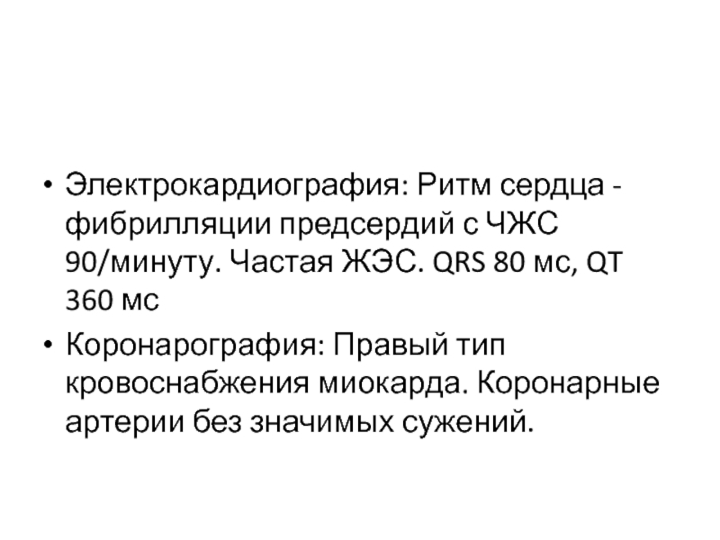 Электрокардиография: Ритм сердца - фибрилляции предсердий с ЧЖС 90/минуту. Частая ЖЭС. QRS 80 мс, QT 360 мсКоронарография:
