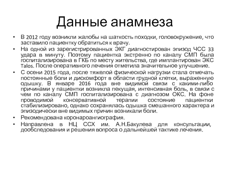 Данные анамнеза В 2012 году возникли жалобы на шаткость походки, головокружение, что заставило пациентку обратиться к врачу.