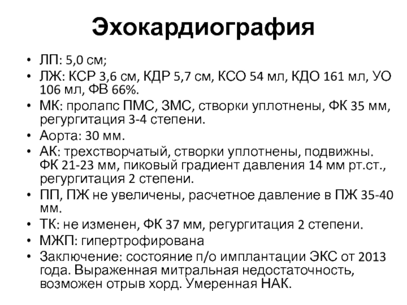 Заключение: состояние п/о имплантации ЭКС от 2013 года. Выраженная митральная недостаточность, возможен отрыв хорд. Умеренная НАК.
