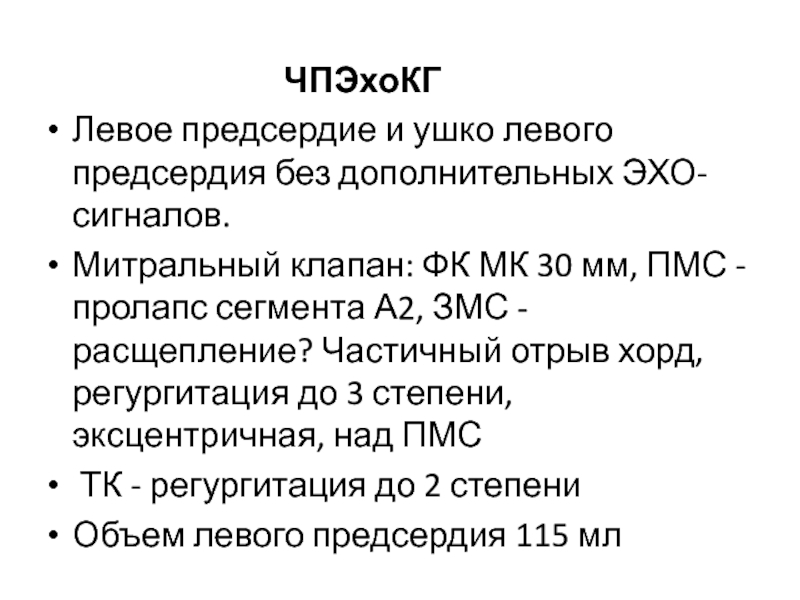 Митральный клапан: ФК МК 30 мм, ПМС - пролапс сегмента А2, ЗМС - расщепление? Частичный отрыв хорд, регургитация до 3 степени, эксцентричная, над ПМС