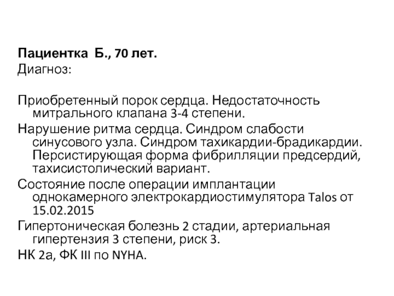 Пациентка Б., 70 лет.Диагноз: Приобретенный порок сердца. Недостаточность митрального клапана 3-4 степени.Нарушение ритма сердца. Синдром слабости синусового узла. Синдром тахикардии-брадикардии. Персистирующая форма фибрилляции предсердий, тахисистолический вариант.Состояние после операции имплантации однокамерного электрокардиостимулятора