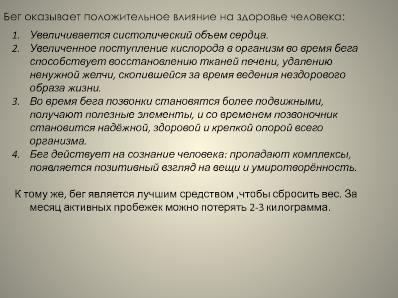 Бег оказывает положительное влияние на здоровье человека:Увеличивается систолический объем сердца.Увеличенное поступление кислорода в организм во время бега