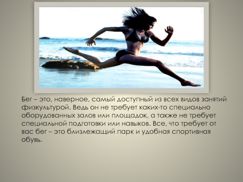 Слайд 2Бег – это, наверное, самый доступный из всех видов занятий
