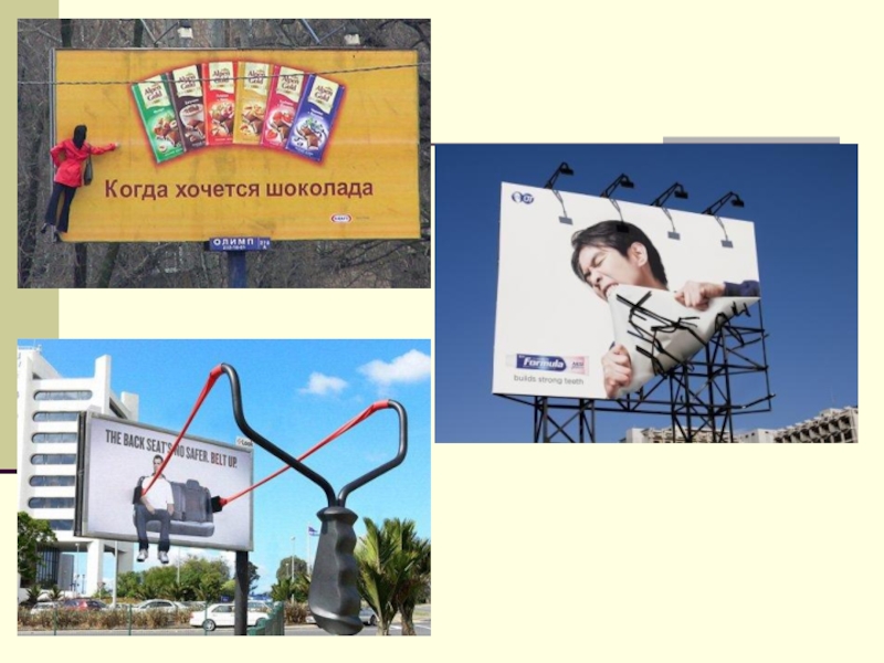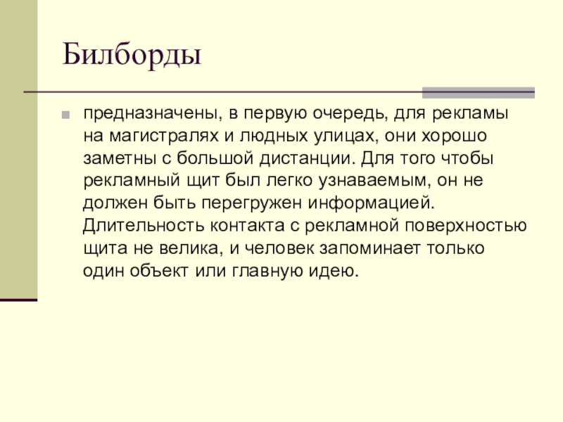 рекламный щит был легко узнаваемым, он не должен быть перегружен информацией. Длительность контакта с рекламной поверхностью щита не велика, и человек запоминает только один объект или главную идею.