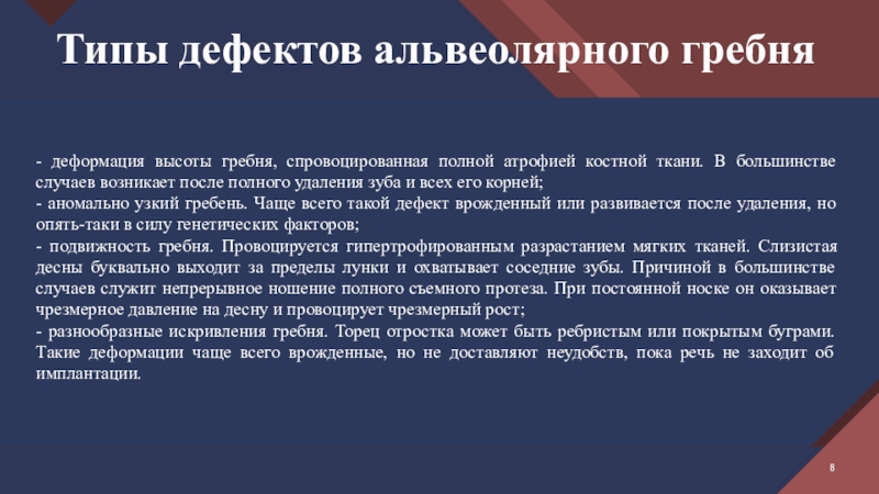Слайд 1Виды дефектов и деформаций альвеолярной части челюстей. Показания и противопоказания