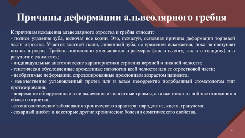 Слайд 4Причины деформации альвеолярного гребня