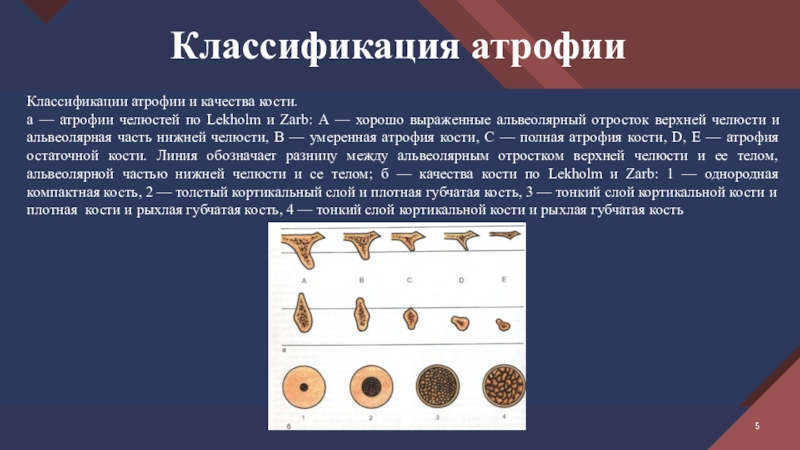 челюсти и альвеолярная часть нижней челюсти, В — умеренная атрофия кости, С — полная атрофия кости, D, Е — атрофия остаточной кости. Линия обозначает разницу между альвеолярным отростком верхней челюсти и ее телом, альвеолярной частью нижней челюсти и се телом; б — качества кости по Lekholm и Zarb: 1 — однородная компактная кость, 2 — толстый кортикальный слой и плотная губчатая кость, 3 — тонкий слой кортикальной кости и плотная кости и рыхлая губчатая кость, 4 — тонкий слой кортикальной кости и рыхлая губчатая кость